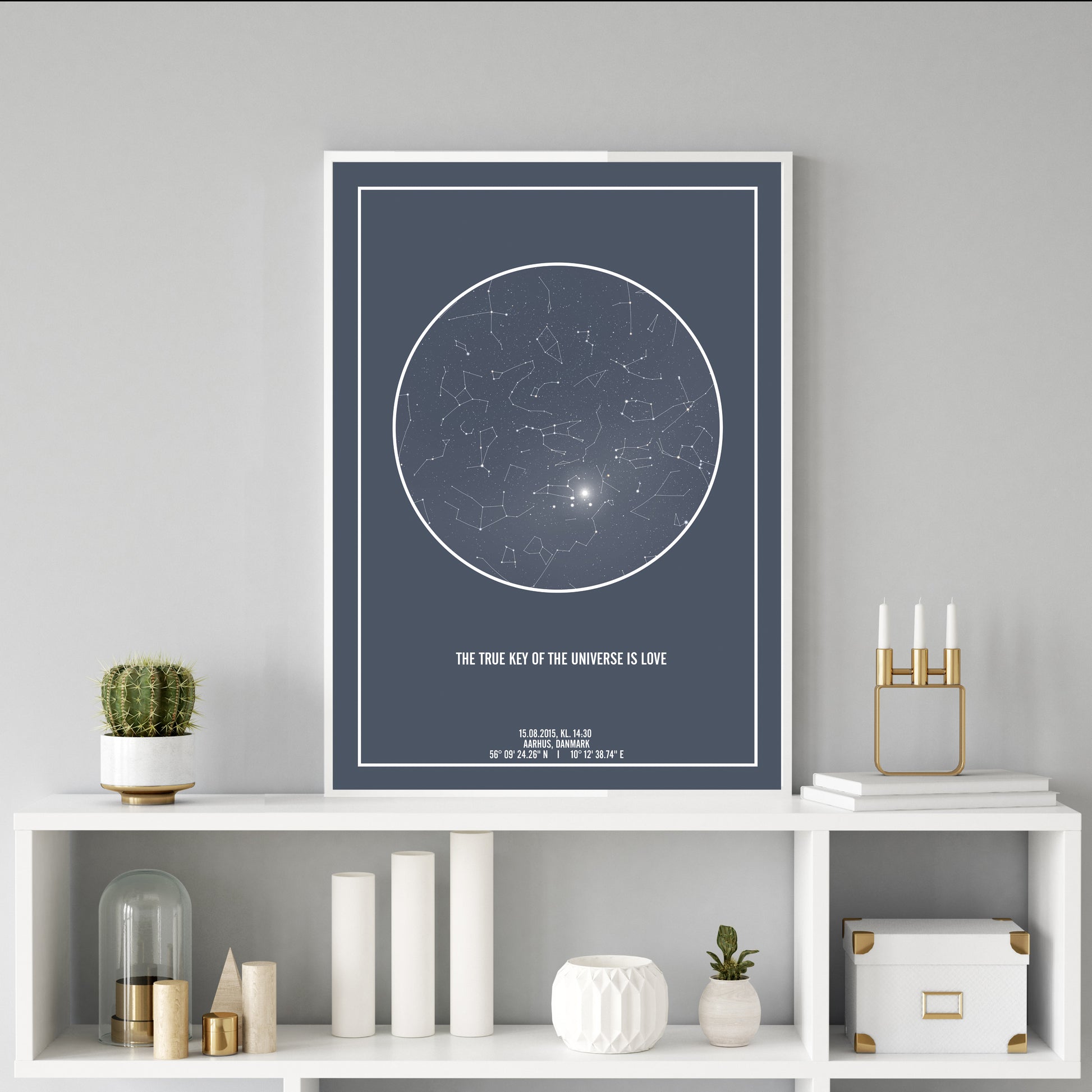 Bestil din personlige stjernehimmel-plakat i dag – inden du ser dig om, hænger din helt egen stjernestund smukt på væggen. 🌟
